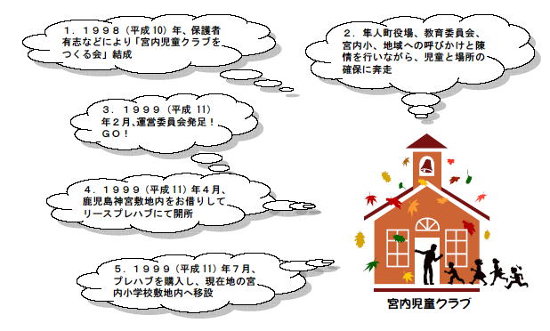 1.1998(平成10)年、保護者有志などにより「宮内児童クラブをつくる会」結成2.隼人町役場、教育委員会、宮内小、地域への呼びかけと陳情を行いながら児童と場所の確保に奔走